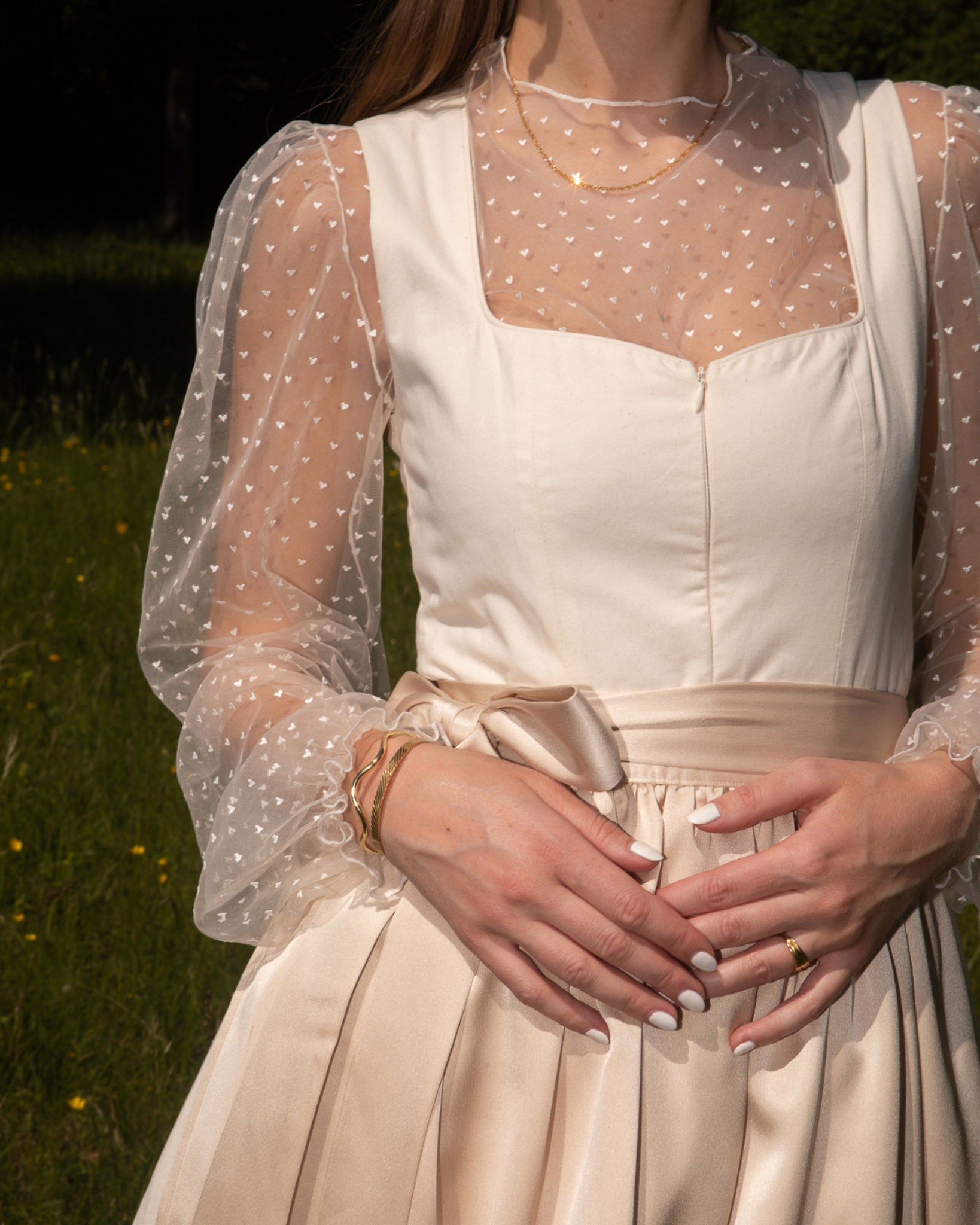 Besonders im Trend: midilange Röcke – wie schon seit Längerem. Um das tiefste Dekolleté geht's zum Glück auch schon lange nicht mehr: hochgeschlossene Blusen mit langen Ärmeln werdet Ihr 2025 oft auf dem Oktoberfest sehen. I promise! Damit's trotzdem cheeky bleibt, setzen wir dieses Jahr bei unseren Dirndlblusen auf transparente, see-through Materialien.