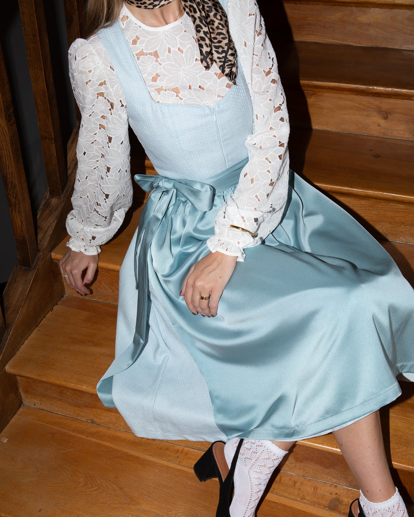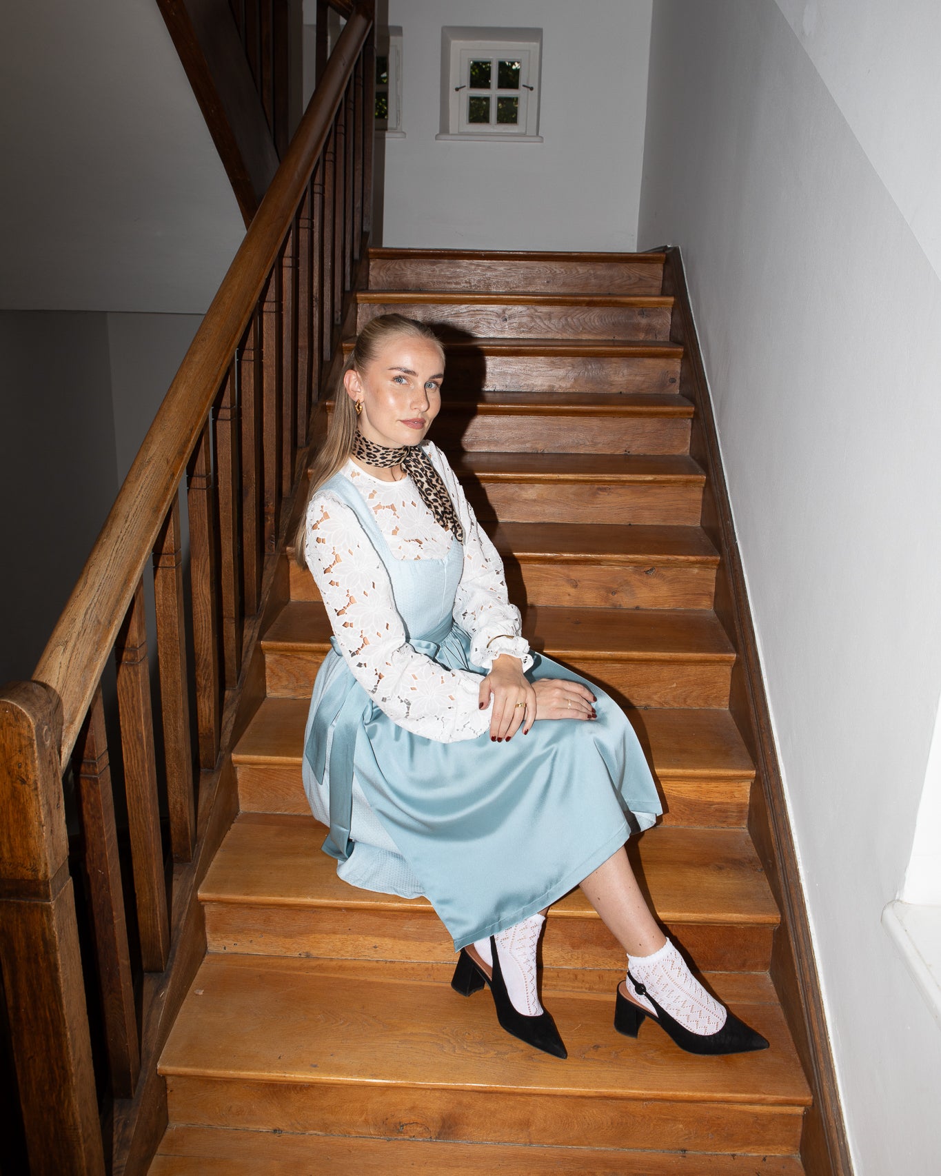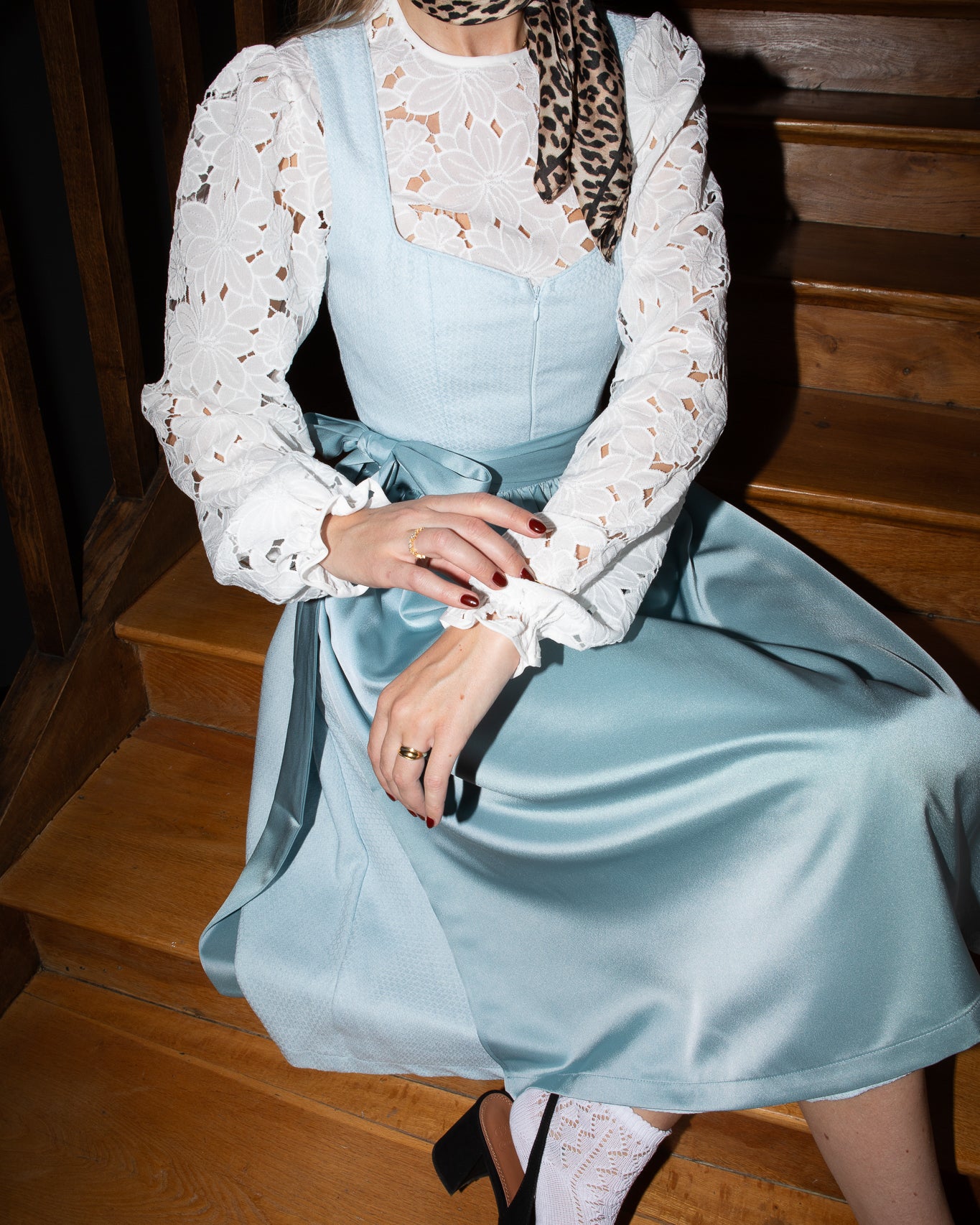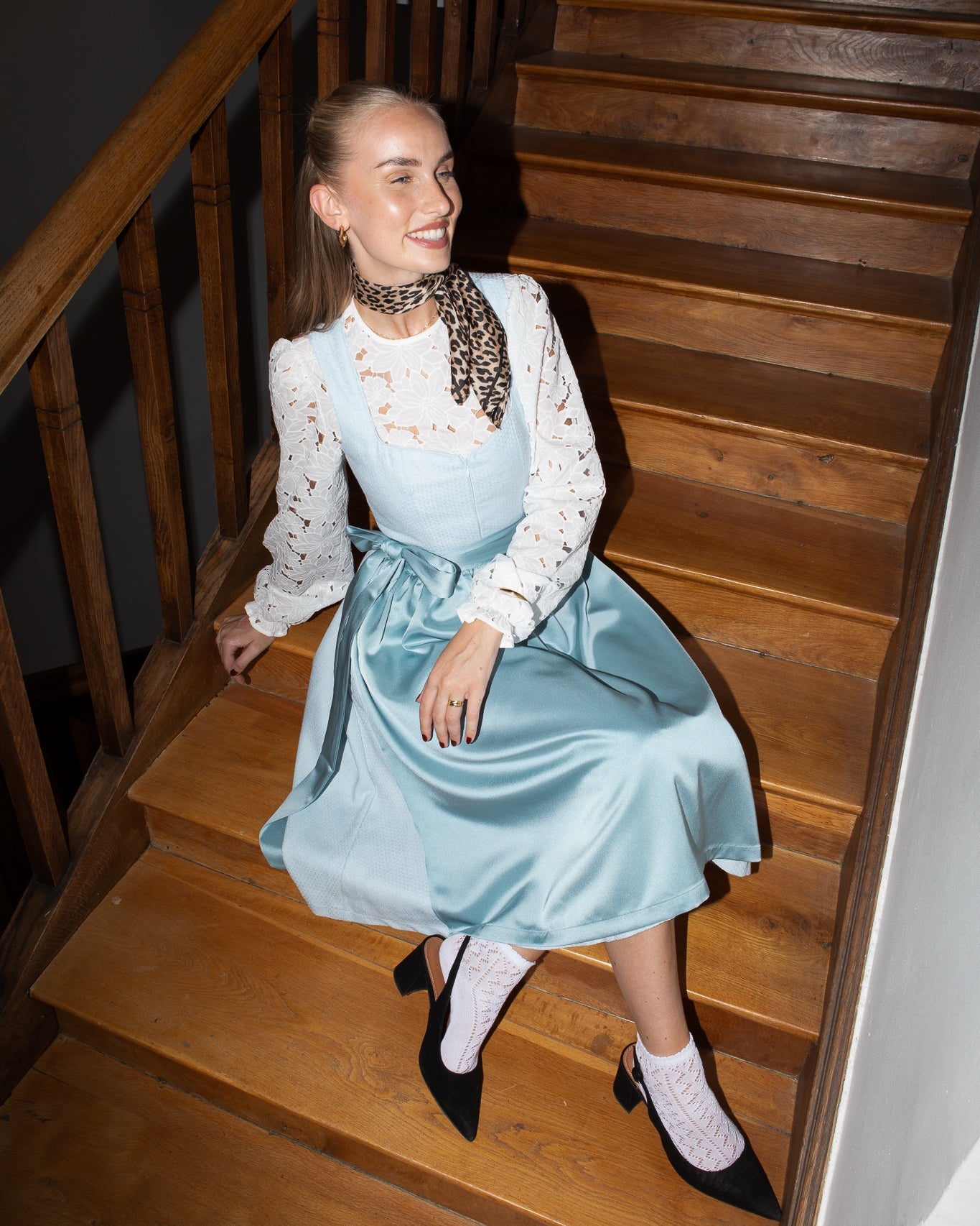 Sanft, markant und voller Kontraste: Das Dirndl Marlies in traumhaftem Babyblau bringt Leichtigkeit und Freude, während die grobe Spitze der Bluse Greta einen traumhaften Akzent setzt. Gemeinsam entsteht ein Look, der zart und modern zugleich ist – luftig, frisch und gemacht für unvergessliche Tage.