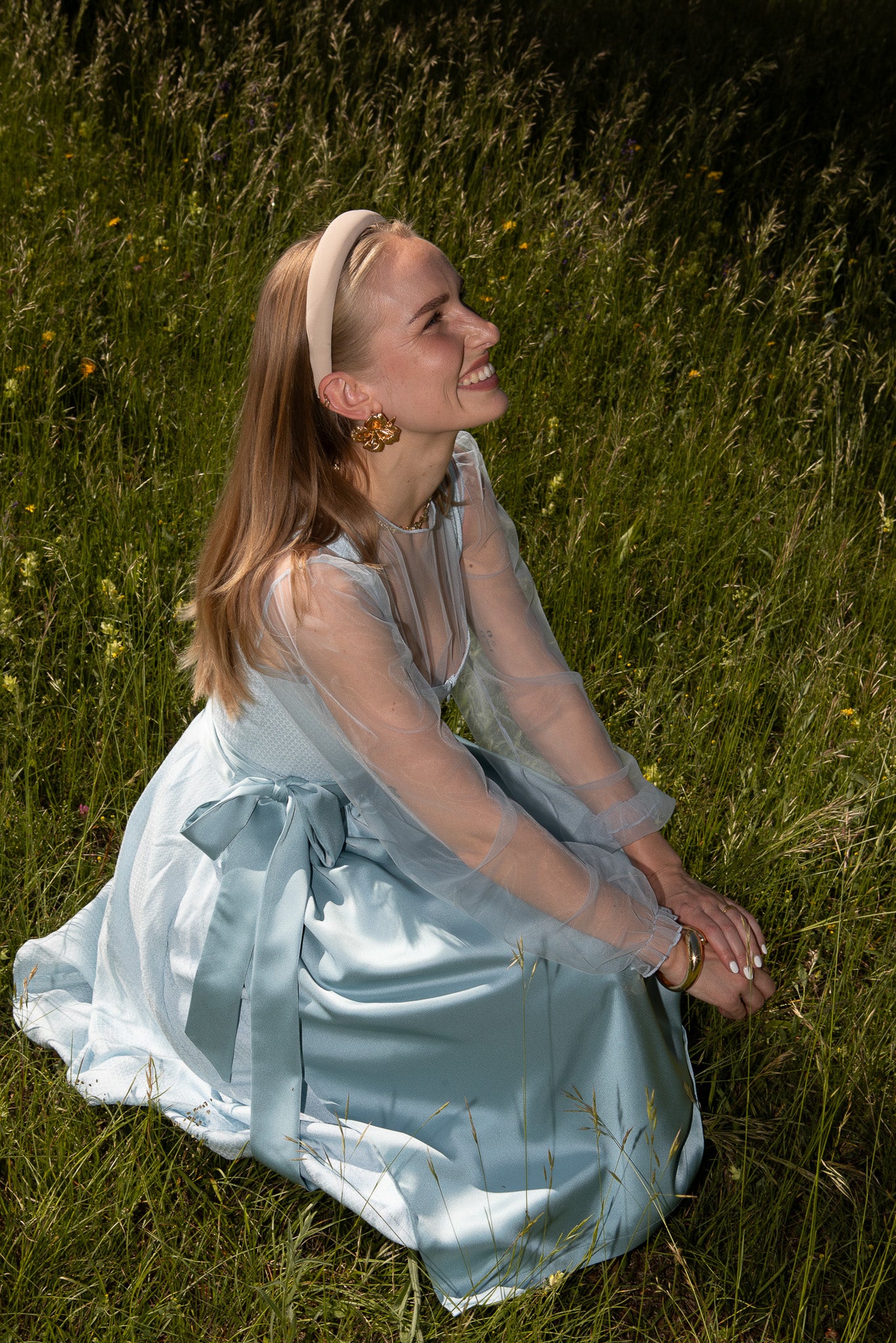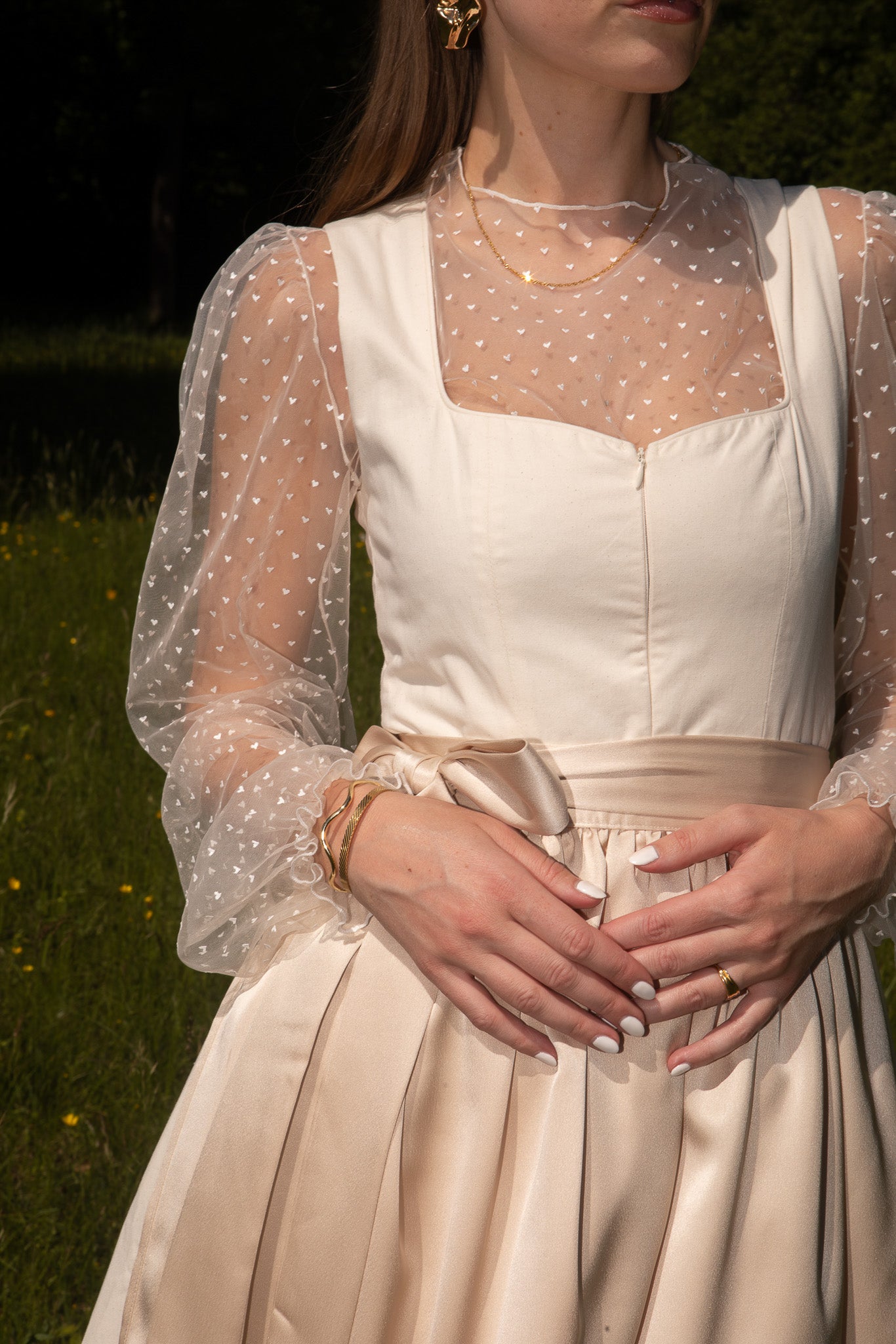 Zart, abgestimmt und ganz pur: Dirndl Marlies in traumhaften hellblau trifft auf unseren absoluten Bestseller Bluse Mina in Naturweiß mit Herzchen.