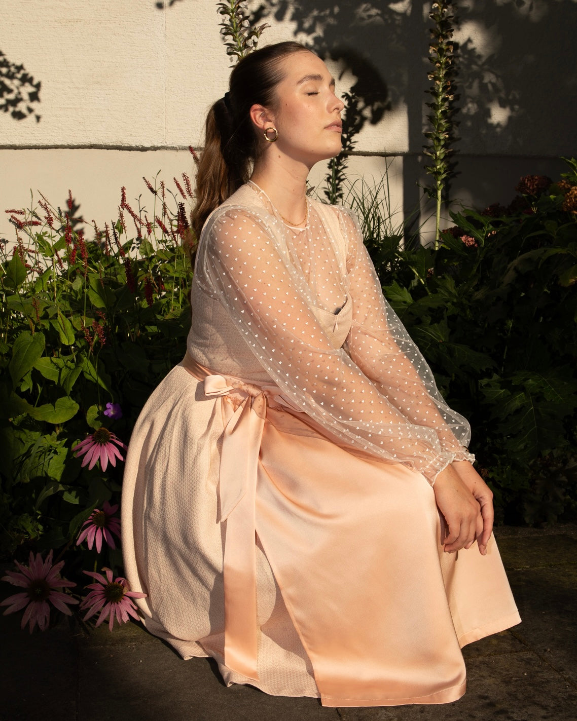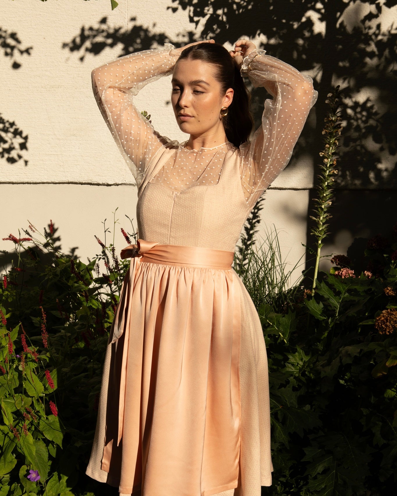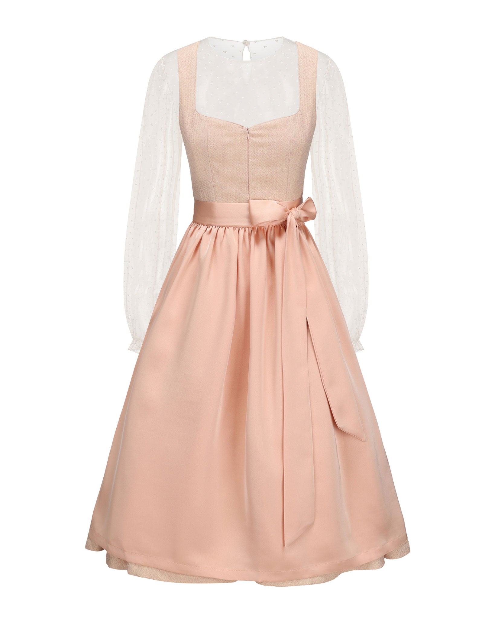 Zart und perfekt abgestimmt: Dirndl Theres in zartem Pfirsich trifft auf unseren absoluten Bestseller Bluse Mina in Naturweiß mit Herzchen.
